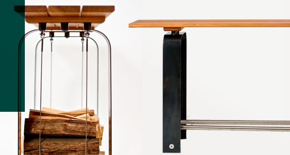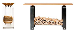 ein. Unter der großzügigen Ablagefläche befindet sich eine freischwingende Holzlege, auf der Brennholz